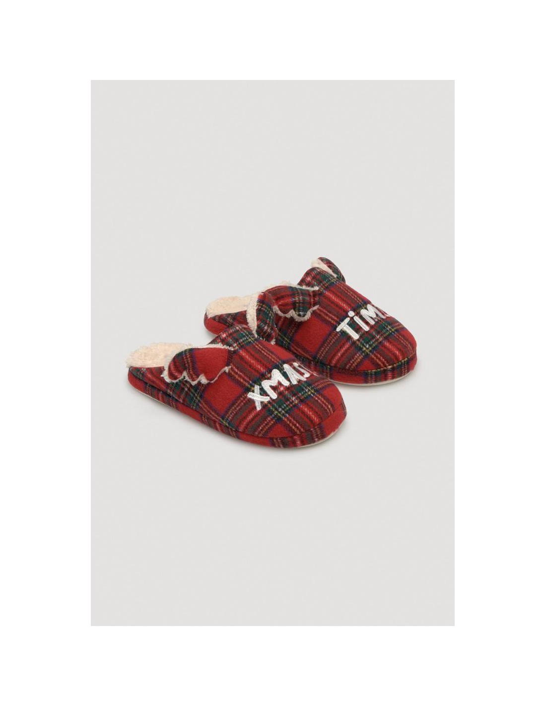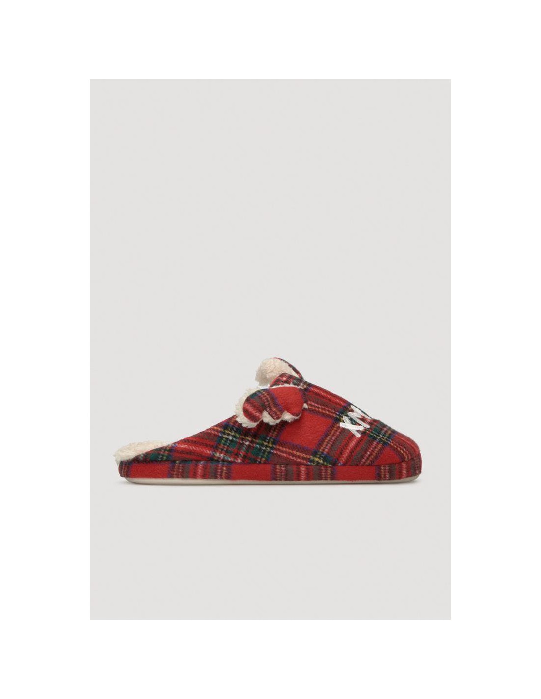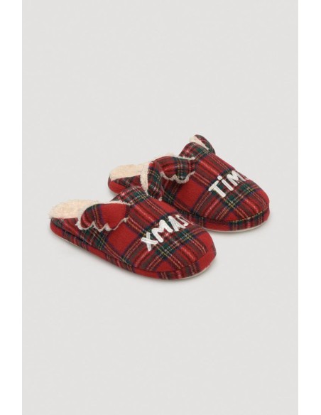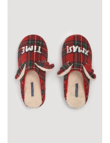 Christmas Edition. Zapatillas de casa mujer destalonada y estampado de cuadro tartán. Suaves, con tonos navideños y orejas de reno en la parte del empeine. En la parte trasera de las zapatillas el tejido es de pelo. Son divertidas de tacto extra soft e interior gustoso, cálido y cómodo. Suela rígida que se adapta perfectamente al suelo. Mismo modelo para infantil y mujer. La suela rígida con aroma a vainilla la torna todavía más cálida.